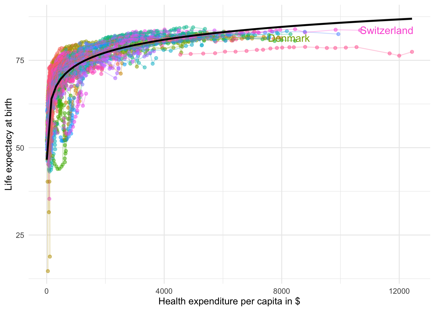 There are two ways to address this problem: polynomial regression and transformations of variables.Polynomial regression involves adding polynomial terms to the regression model. For example, if the relationship between life expectancy and health expenditures is quadratic, then we could add a term for the square of health expenditures to the model. Transformations of variables involve transforming the independent or dependent variables (or both) before running the regression. For example, if the relationship between life expectancy and health expenditures is logarithmic, then we could take the logarithm of both variables before running the regression.